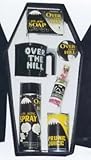 - Over the Hill Coffin gift box includes coffee mug, over the hill soap, a button, anti-aging spray, candy age-reversal pills and prune juice.